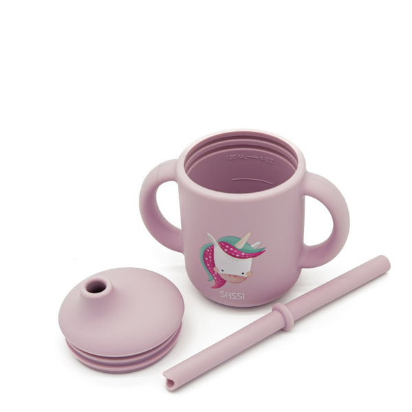 Bicchiere in silicone per bambini, dotato di manici e coperchio con cannuccia e decorato con il grazioso unicorno Sparkly.