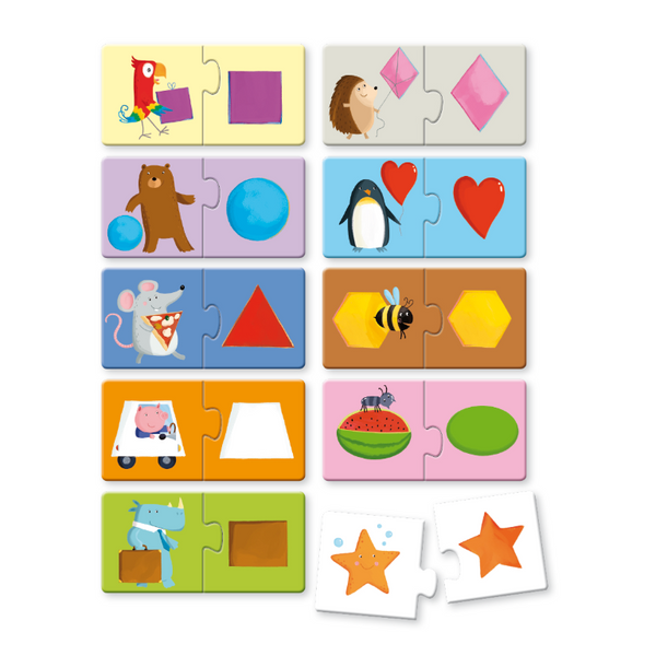 Impara le forme con la nuova edizione della fortunata collana Puzzle 2! Leggi il libretto, poi impara a distinguere le principali forme geometriche assemblando le 10 coppie di mini-puzzle.
