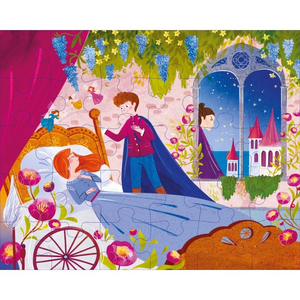 Attraversa i rovi che circondano il castello e aiuta il principe a risvegliare la principessa vittima di un terribile incantesimo. Un libro di 10 pagine con un classico della letteratura per bambini e un puzzle di 30 pezzi.