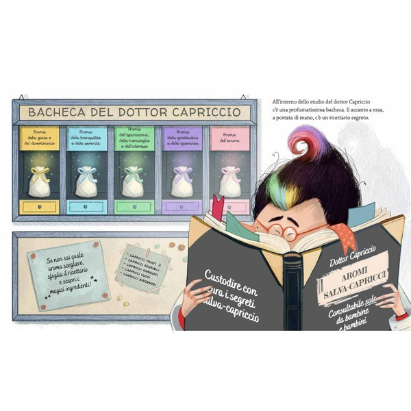 Il dottor Capriccio è un dottore speciale: ha un vero talento nell’aiutare i bambini che soffrono di capricci. All’interno dello studio del dottor Capriccio c’è una profumatissima bacheca, e accanto a essa, un ricettario segreto. Il dottore spiega ai bambini che, per placare i capricci, bisogna avvicinarsi alla bacheca degli aromi, scegliere accuratamente la giusta essenza “salva capriccio” e custodirla vicino al proprio cuore. Solo i bambini sanno di cosa si tratta, è scritto nel ricettario segreto!