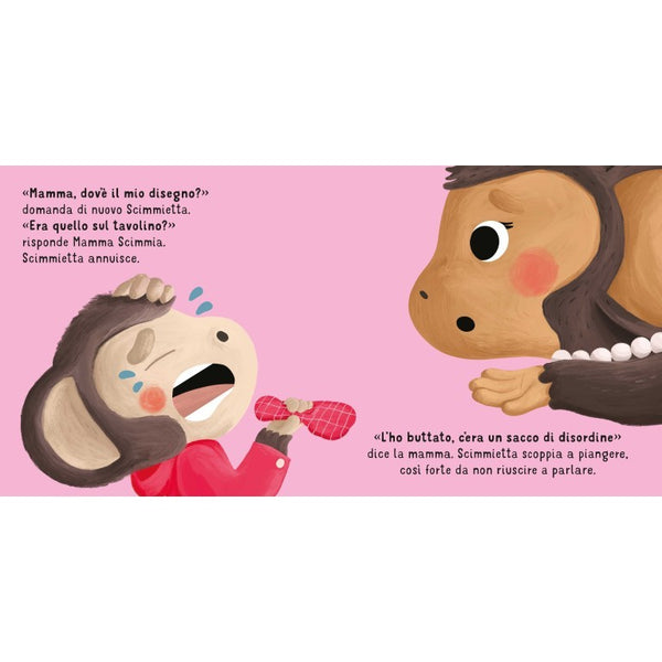 Quante volte abbiamo sentito dire, o abbiamo detto, ai bambini “Smettila di fare i capricci”? Ma sono veramente capricci o è solo un modo che hanno i più piccoli di esprimere le loro emozioni? È quello che, insieme, cercano di capire Scimmietta e la sua mamma: la cucciola, infatti, dopo che la mamma butta via un disegno che ha fatto senza prestare troppa attenzione, scoppia in un pianto disperato, che si risolve quando la mamma, con empatia e calma, riesce a capire che il suo pianto non era un capriccio, bensì un modo per esprimere la sua tristezza e la sua frustrazione.
