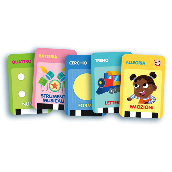 30 carte fronte/retro e 20 attività educative per imparare tante nuove cose: lettere, numeri, emozioni, strumenti musicali e forme geometriche.