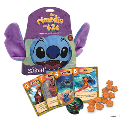 Contenuto: 22 carte, 12 segnalini vittoria, 1 segnalino Stitch, 1 sacchetto di peluche, 1 regolamento.